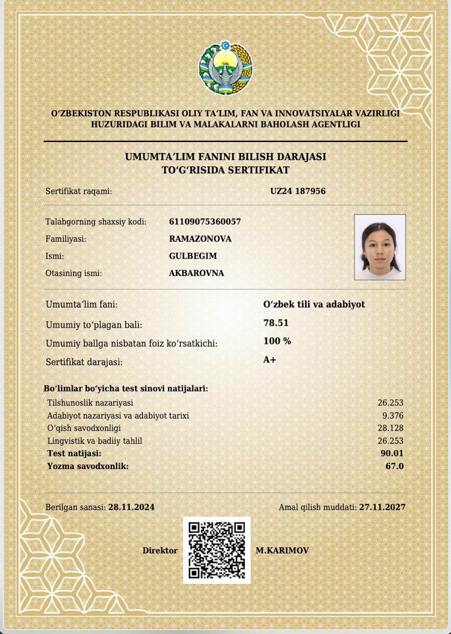 1. Oliy ta'lim muassasasida grand asosida o'qiydi. 2. Ona tili va adabiyot fanidan eng eng yuqori 78 ball egasi. 3. Esse bo'yicha Hodiyev Educationda professional tahsil olgan. 4. Hodiyev Education onlayn güruhlarda repetitorlik faoliyatini olib boradi.