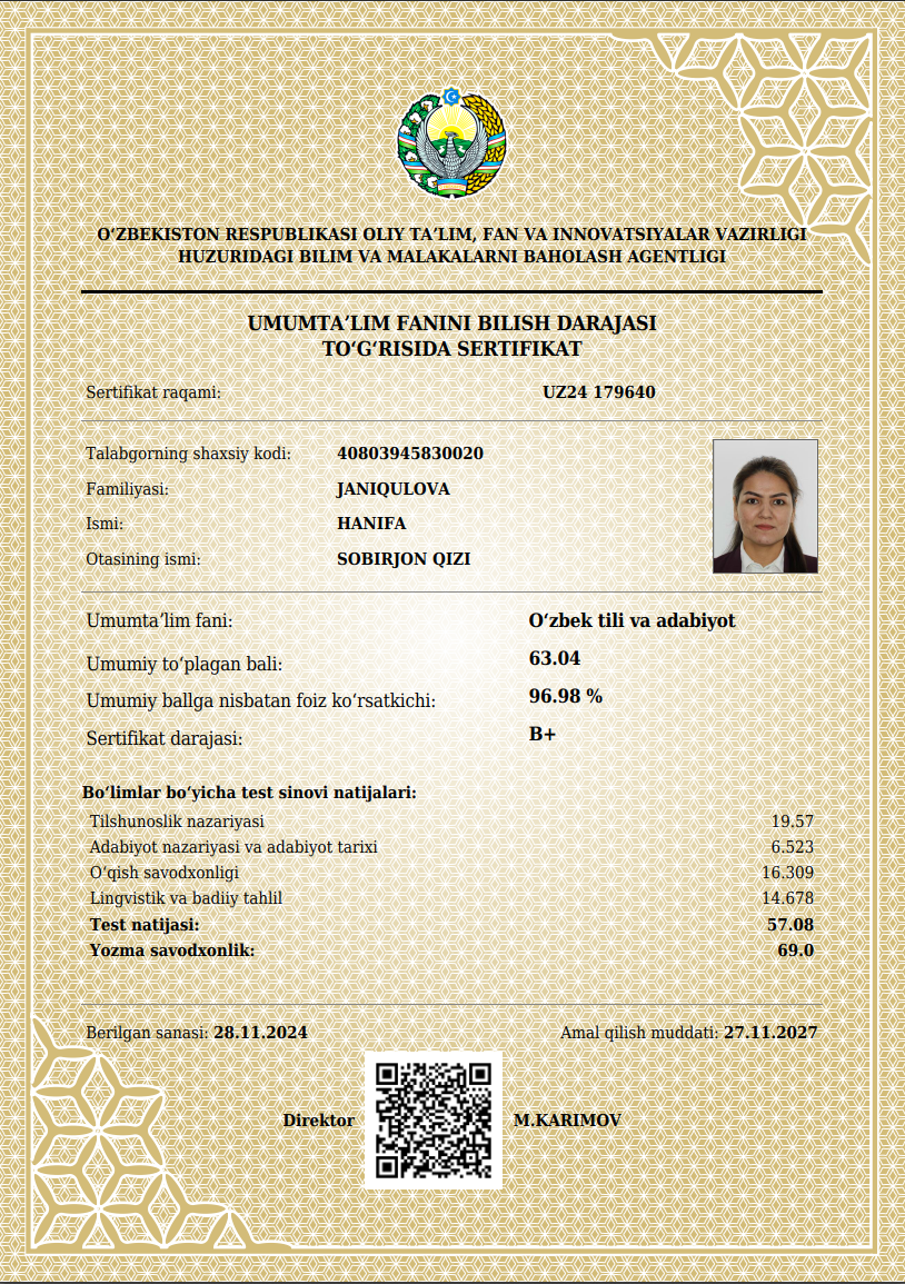 Esse bo'yicha guruhi va ayni damda tayyorlanadigan o'quvchilari mavjud. Milliy sertifikat ona tili va adabiyot faniga mo'ljallangan telegram kanali bor. Bir yil davomida yuzlab o'quvchilarning sertifikat olishiga sababchi ustoz. Onlayn va oflayn repetitorlik faoliyatini olib boradi.